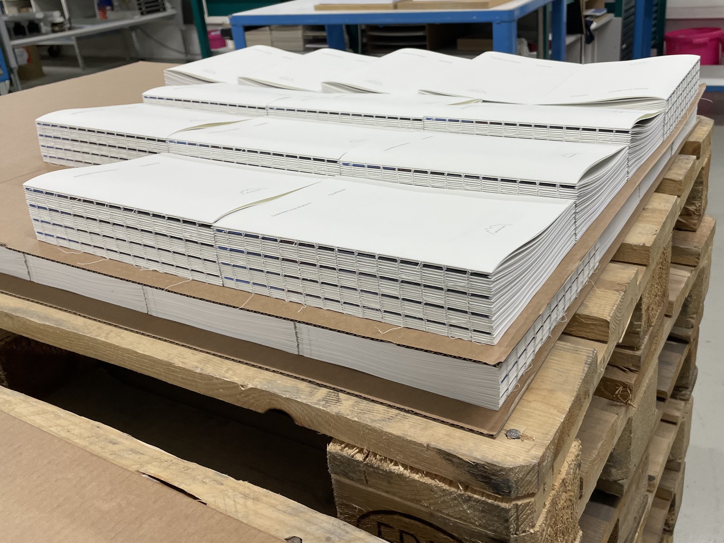 Fertige Druckbögen (jeweils 4), die gebunden werden / Bindearbeit an einer alten Schweizer Maschine, die erst vor kurzem (über Österreich-Slowakei) ihren Weg wieder zurück in die Schweiz fand / Pressung der fertigen Buchblöcke / Clichées für Umschlagprägung auf Pröge-platte / fertiger Umschlag